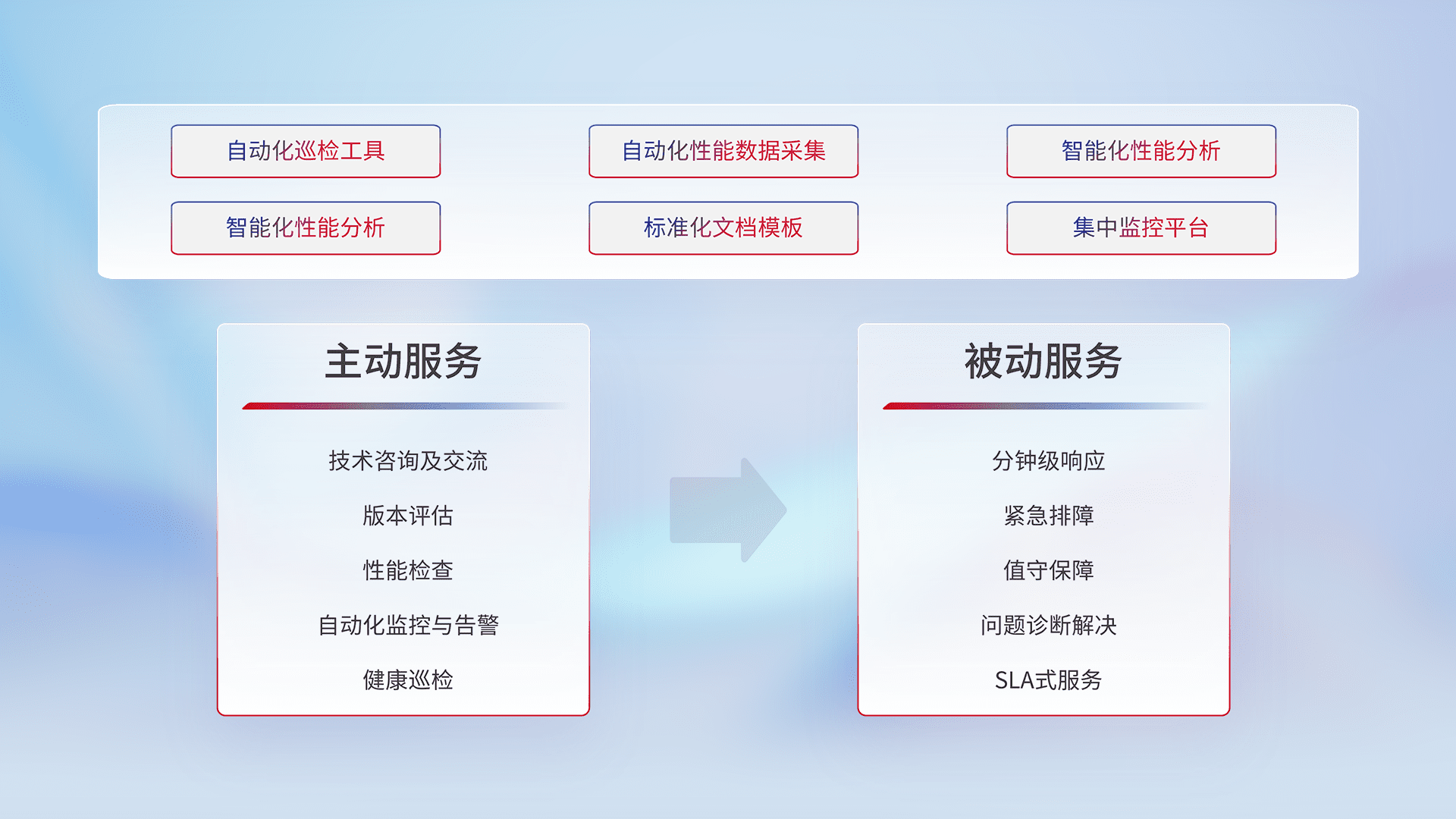 智能化工具和标准化文档,,保障服务质量,,提供主动服务(包含技术咨询、、、、版本评估、、、、性能检查、、、、自动化监控与告警、、、健康巡检)和被动服务包含(分钟级响应、、紧急排障、、值守保障、、、问题诊断解决、、、SLA服务)。。。
